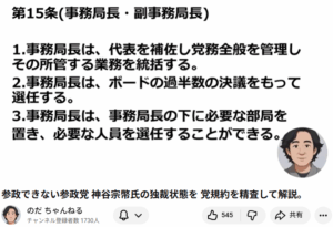 参政できない参政党 神谷宗幣氏の独裁状態を 党規約を精査して解説。 のだ ちゃんねる公開されたこの動画は、で、参政党の党規約を詳細に分析し、党代表である神谷宗幣氏の権限集中と、党員が党運営に参加できない実態について解説し […] - 【元参政党ボード・篠原常一郎氏】公明党が連立離脱により、乱世の政局に「女性天皇」実現を期待していた
