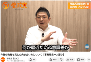 今後の政権与党との向き合い方について【事務局長一人語り】 この動画は、参政党の神谷宗幣代表(事務局長)が、衆議院選挙の総括と今後の政権与党(自民党)との向き合い方について語ったものです。 主な内容 1. 衆議院選挙の振り […] - 【公式見解発表】SNS上の誤情報・陰謀論に対するチームみらいの回答と、誹謗中傷への法的措置