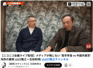 【ニコニコ全編ライブ配信】メディアが報じない "高市早苗 vs 中国共産党" 攻防の裏側 (山口敬之 × 石田和靖) この動画は、ジャーナリストの山口敬之氏をゲストに迎え、...