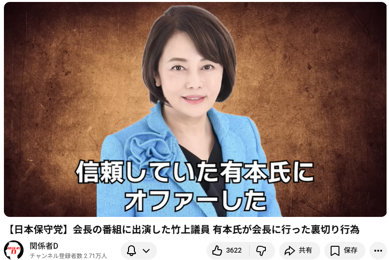 【日本保守党】会長の番組に出演した竹上議員 有本氏が会長に行った裏切り行為 この動画は、日本保守党の百田尚樹氏や有本香氏と、元DHC会長の吉田嘉明氏、そして離党した竹上裕子議員をめぐる騒動について解説しています。 主な内容 吉田会長と有本氏の確... -