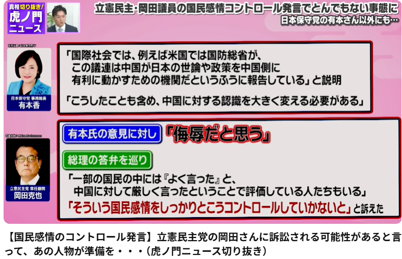 【国民感情のコントロール発言】立憲民主党の岡田さんに訴訟される可能性があると言って、あの人物が準備を・・・(虎ノ門ニュース切り抜き) この動画は、「真相深入り!虎ノ門ニュース」の切り抜き動画で、立憲民主党の岡田克也氏による「国民感情をコン... -