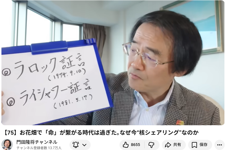 【75】お花畑で「命」が繋がる時代は過ぎた。なぜ今“核シェアリング”なのか この動画は、ジャーナリストの門田隆将氏による「門田隆将チャンネル」の第75回配信です(2025年12月26日公開)。主な内容は、日本の安全保障と核議論、特に「核シェアリング」の... -
