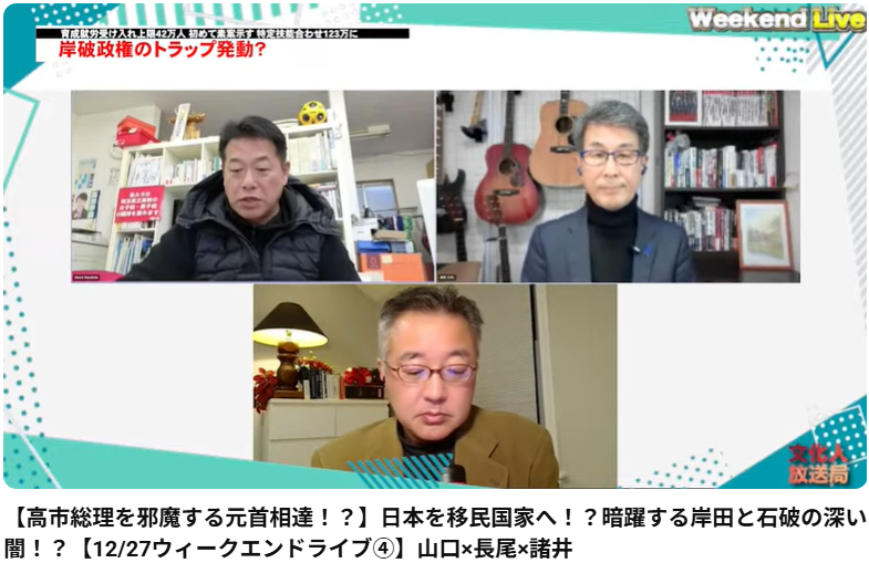 【高市総理を邪魔する元首相達!?】日本を移民国家へ!?暗躍する岸田と石破の深い闇!?【12/27ウィークエンドライブ④】山口×長尾×諸井 この動画は、YouTubeチャンネル「文化人ウィークエンドライブ」による番組の一部です。 動画では、山口敬之氏、長尾... -