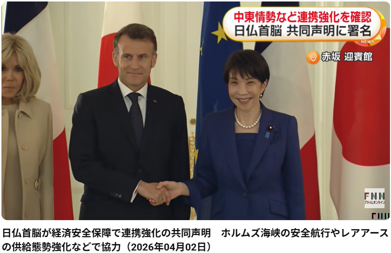 日仏首脳が経済安全保障で連携強化の共同声明 ホルムズ海峡の安全航行やレアアースの供給態勢強化などで協力(2026年04月02日) この動画は、2026年4月1日に行われた高市総理大臣とフランスのマクロン大統領による首脳会談のニュースです。 主な内容 日仏... -