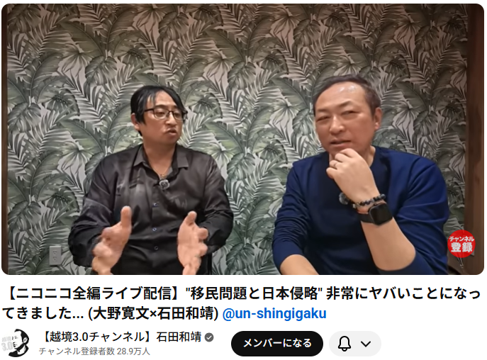 【ニコニコ全編ライブ配信】"移民問題と日本侵略" 非常にヤバいことになってきました... (大野寛文×石田和靖) @un-shingigaku この動画は、【越境3.0チャンネル】石田和靖氏と、ゲストの大野寛文氏(伊勢市議会議員)による対談で、主に大野氏の伊勢市議会... -