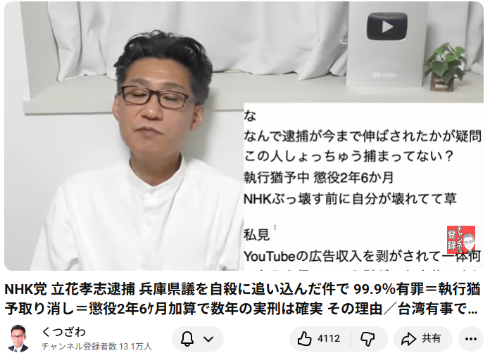 NHK党 立花孝志逮捕 兵庫県議を自殺に追い込んだ件で 99.9%有罪=執行猶予取り消し=懲役2年6ケ月加算で数年の実刑は確実 その理由/台湾有事で自衛隊出動は妥当=82% 民意はまとも20251109 この動画は、政治団体「NHK党」の代表である立花孝志氏の逮捕と... -