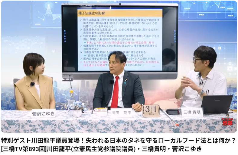特別ゲスト川田龍平議員登場!失われる日本のタネを守るローカルフード法とは何か?[三橋TV第893回]川田龍平(立憲民主党参議院議員)・三橋貴明・菅沢こゆき この動画は、YouTubeチャンネル「三橋TV」の第893回で、立憲民主党の川田龍平参議院議員をゲスト... -
