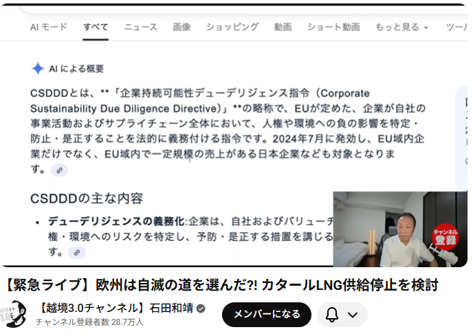 【緊急ライブ】欧州は自滅の道を選んだ?! カタールLNG供給停止を検討 この動画は、「【越境3.0チャンネル】石田和靖」氏が、欧州連合(EU)の新たな指令が原因で、カタールがEUへのLNG供給停止を検討しているという話題を解説するライブ配信です。 ウクラ... -