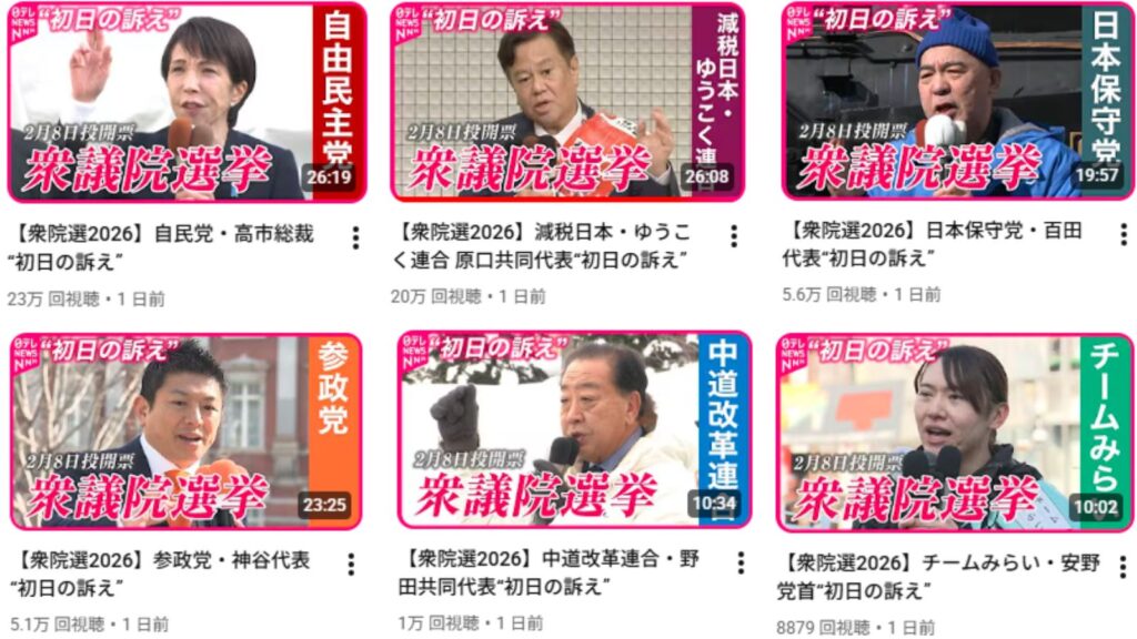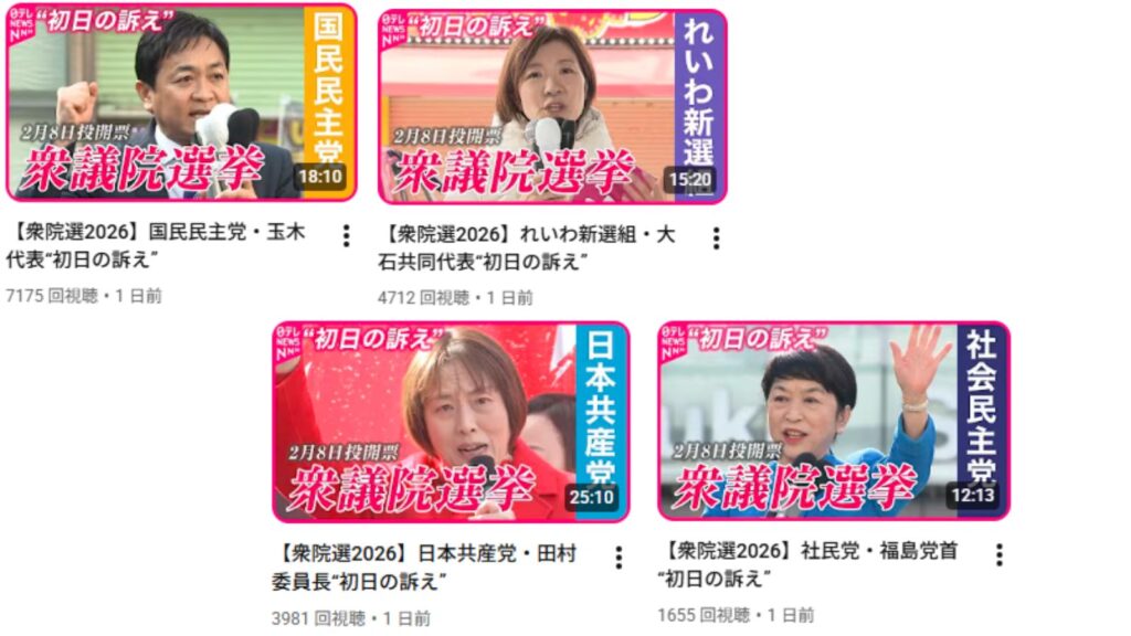 • 既存政党の苦戦: 国民民主党れいわ新選組共産党などは1万回を下回っており、YouTubeの初速としては厳しいスタートとなっています。