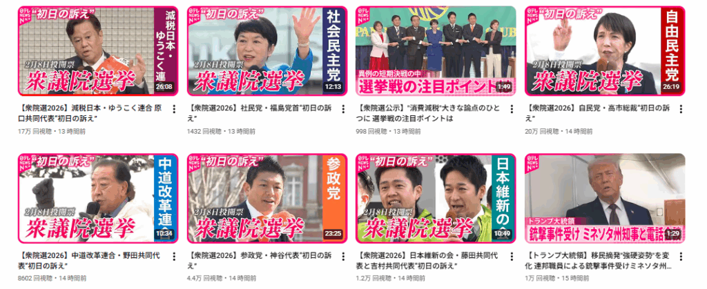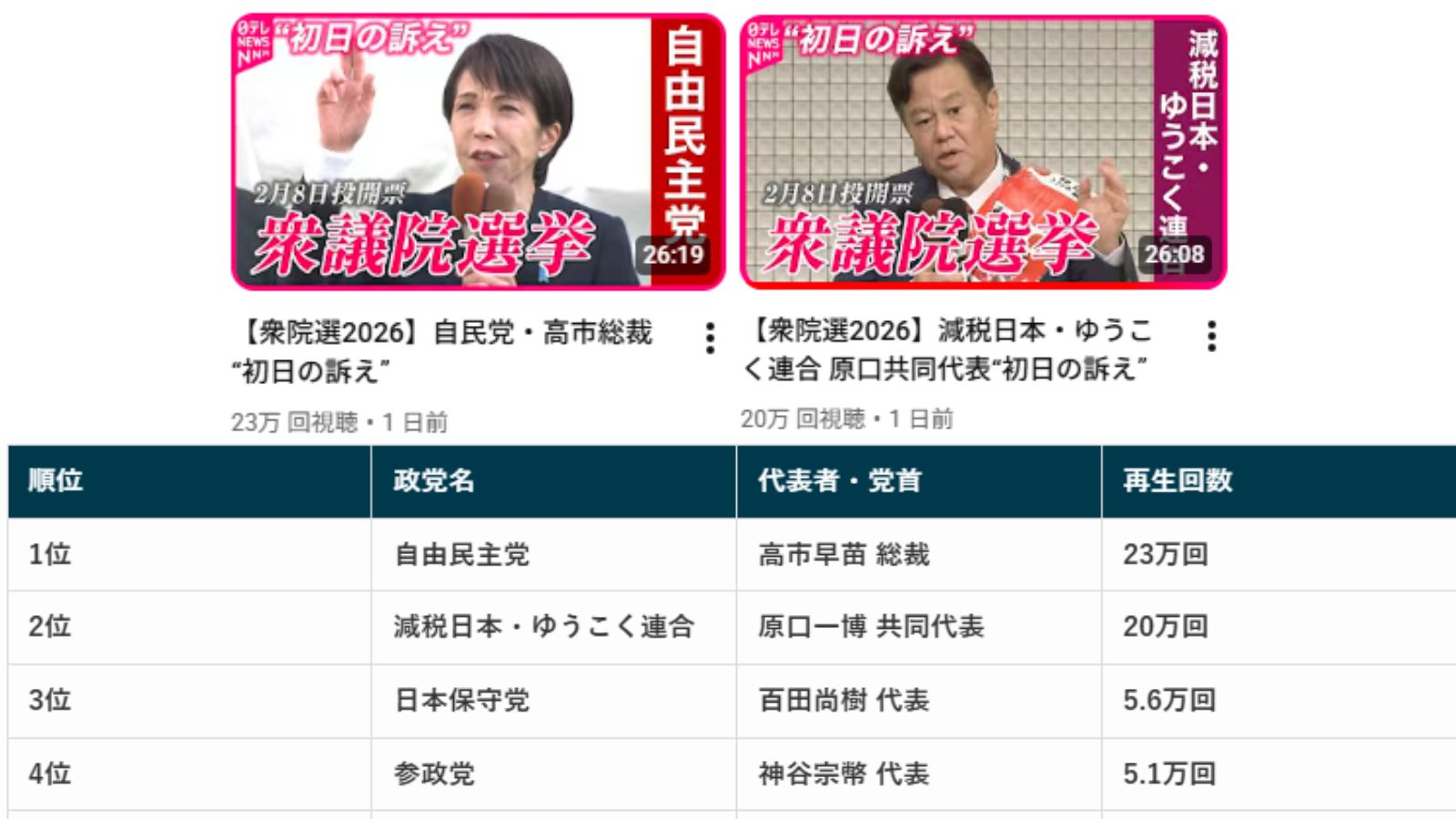 【衆院選2026】自民・ゆうこく連合が驚異の再生回数で圧倒的リード!3位以下に大差をつける「2強」のネット注目度ランキング