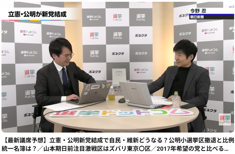 この動画は、YouTubeチャンネル「選挙ドットコムちゃんねる」によるもので、朝日新聞の今野忍記者をゲストに迎え、立憲民主党と公明党の新党結成や、それに伴う最新の議席予想、今後の政局の展望について深く掘り下げています。