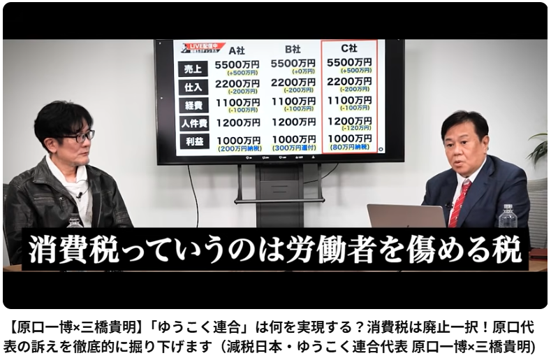 こちらの動画は、経済評論家の三橋貴明氏のYouTubeチャンネル「三橋TV」において、「ゆうこく連合」代表の原口一博氏(衆議院議員)をゲストに迎え、消費税廃止や日本経済のあり方について深く議論した内容となっています。