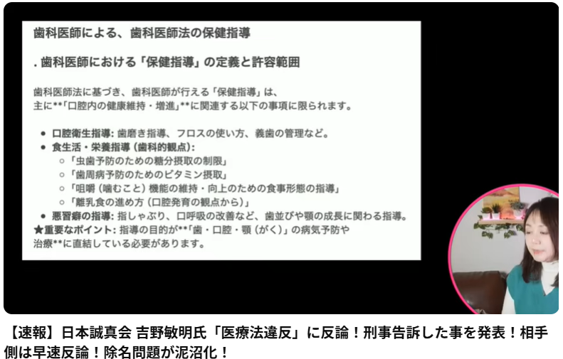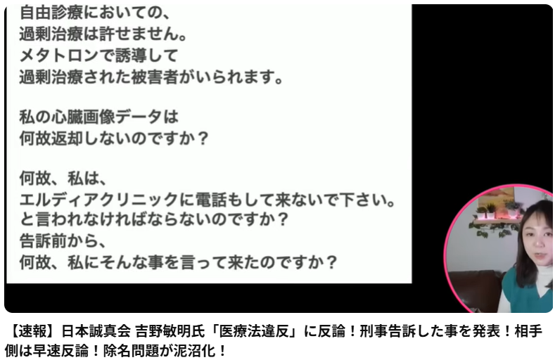 • 主張: 吉野氏側は、医師法17条違反(医師でない者が医業を行うこと)の指摘は全くの事実誤認であり、感情的な応酬ではなく法に則って冷静に対応するとしています。 [11:02], [11:16]