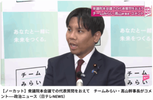 この動画は、日テレNEWSによる政治ニュースで、衆議院本会議での代表質問を終えた「チームみらい」の高山幹事長への囲み取材の様子を収めたものです。