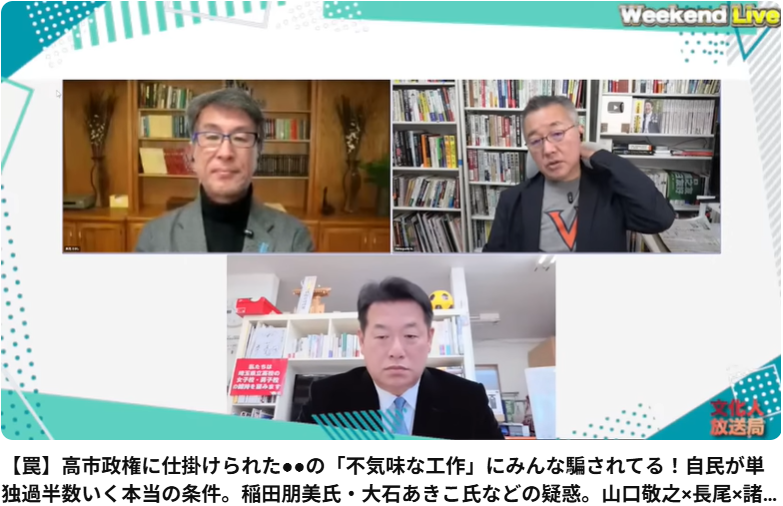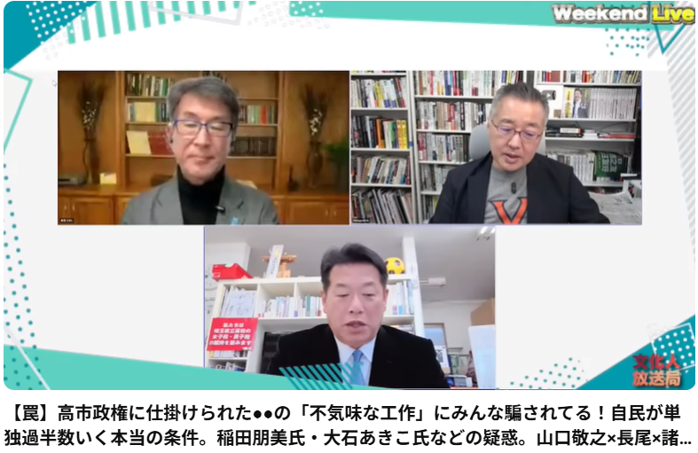 この動画は、2026年1月31日に配信された「文化人放送局」のウィークエンドライブです。ジャーナリストの山口敬之氏、前衆議院議員の長尾たかし氏、埼玉県議会議員の諸井真英氏の3名が出演し、最新の選挙情勢について議論しています。