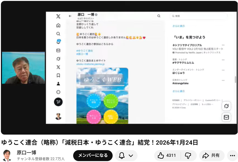 この動画は、2026年1月24日に原口一博氏が配信したライブ映像で、新党「減税日本・ゆうこく連合」(略称:ゆうこく連合)の結党について報告しています。