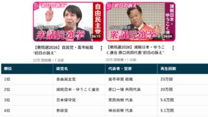 【衆院選2026】自民・ゆうこく連合が驚異の再生回数で圧倒的リード!3位以下に大差をつける「2強」のネ...