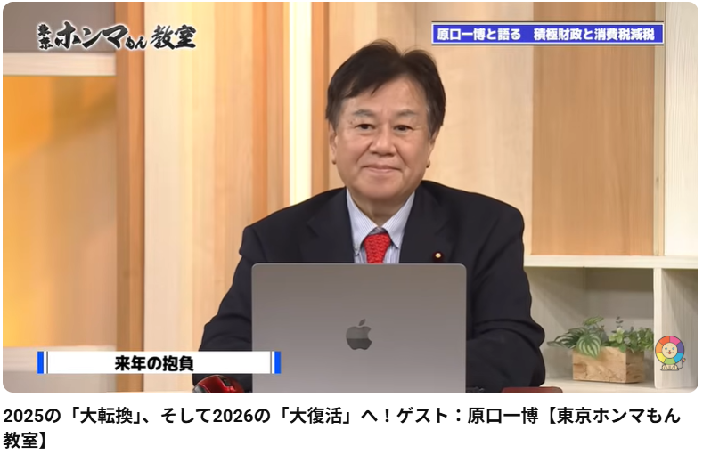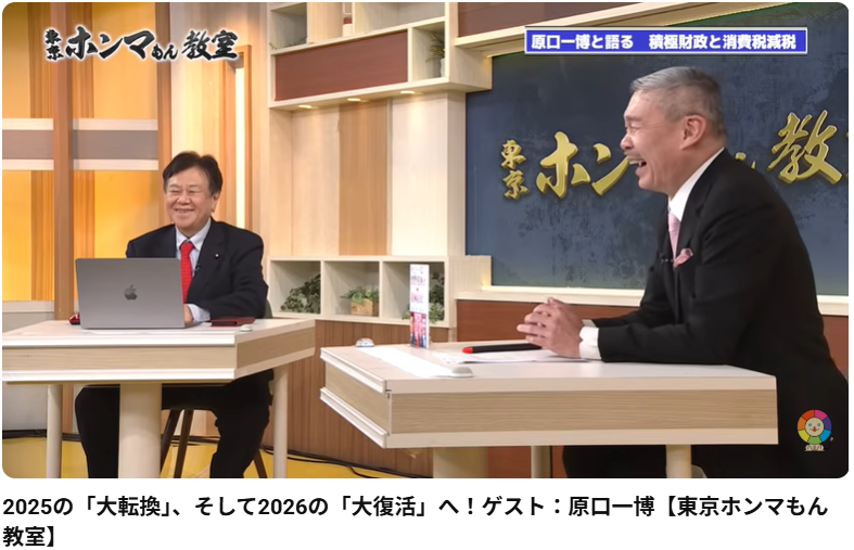 - 原口さんとのトーク、わかりやすく楽しく拝見できました。ありがとうございました。 26年になりましたが、早い時期に選挙実施して、高市政権に抵抗する不要な自民党議員を一掃し政策をどんどん進めたいですね。