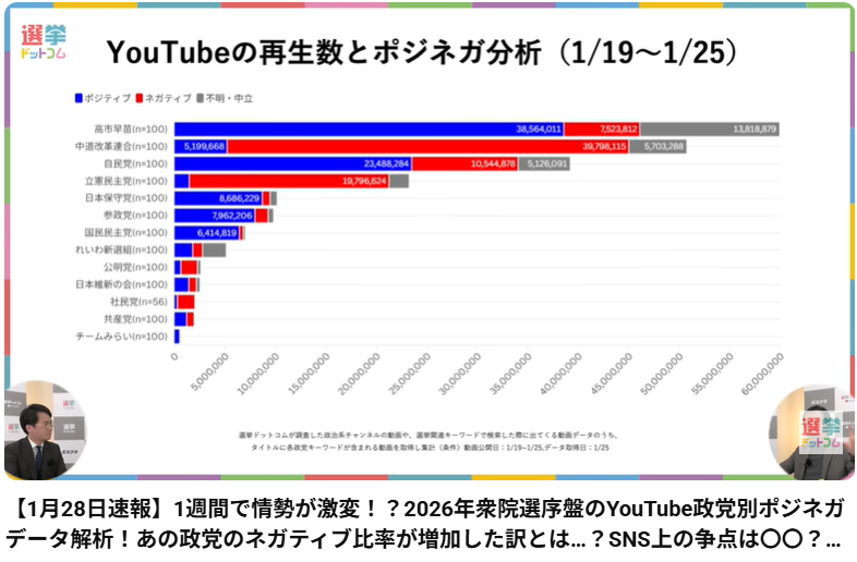 【1月28日速報】1週間で情勢が激変!?2026年衆院選序盤のYouTube政党別ポジネガデータ解析!あの政党のネガティブ比率が増加した訳とは…?SNS上の争点は〇〇?/重大告知あり!|選挙ドットコム