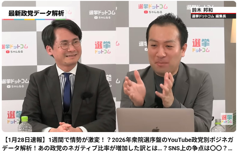 このYouTube動画は、選挙ドットコムちゃんねるによる「2026年衆院選に向けたYouTube上の政党別ポジネガデータ解析(1月28日速報版)」に関する解説動画です。
