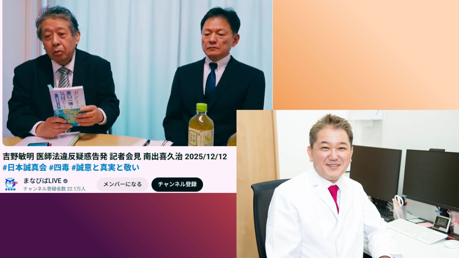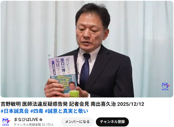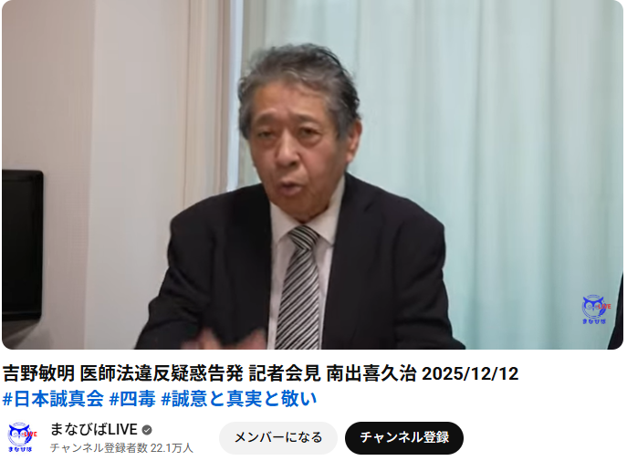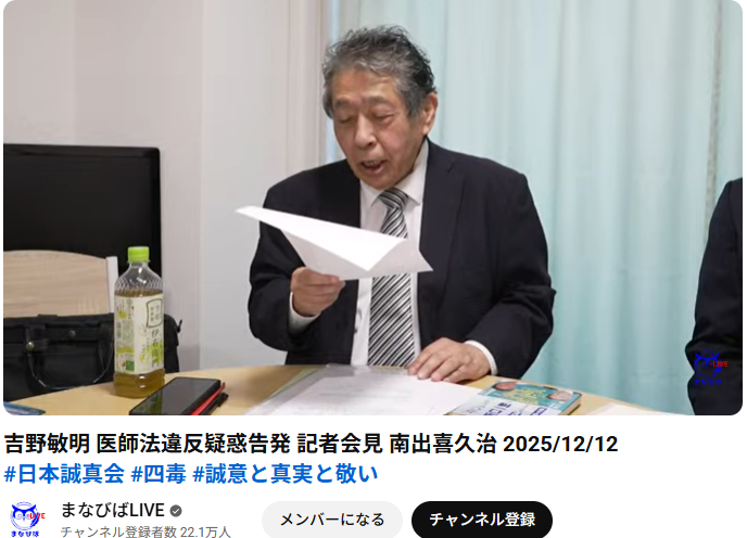 この動画は2025年12月12日に行なわれた日本誠真会 吉野敏明氏の医師法違反疑惑の告発について、南出喜久治氏と吉野氏の被害者とされる渦中のAさん(藤田氏)が記者会見を行う様子を「まなびばLIVE」がライブ配信したアーカイブです。