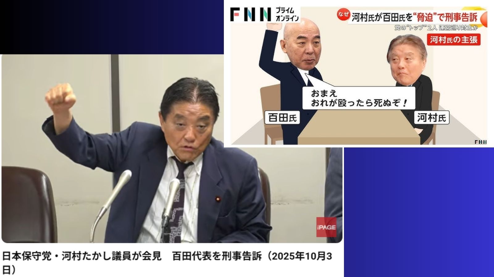 河村たかし衆議院議員は、日本保守党の共同代表であった百田直樹氏を威力業務妨害罪と脅迫罪で刑事告訴したことを発表しました。
