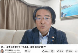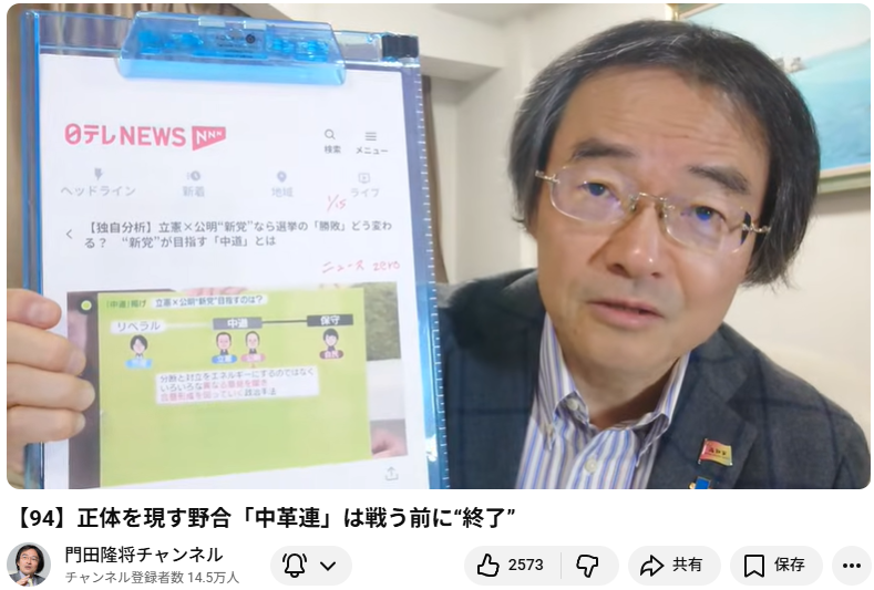 門田氏は、立憲民主党と公明党の合流(中道改革連合)を「理念も政策もない野合」と強く批判しています。