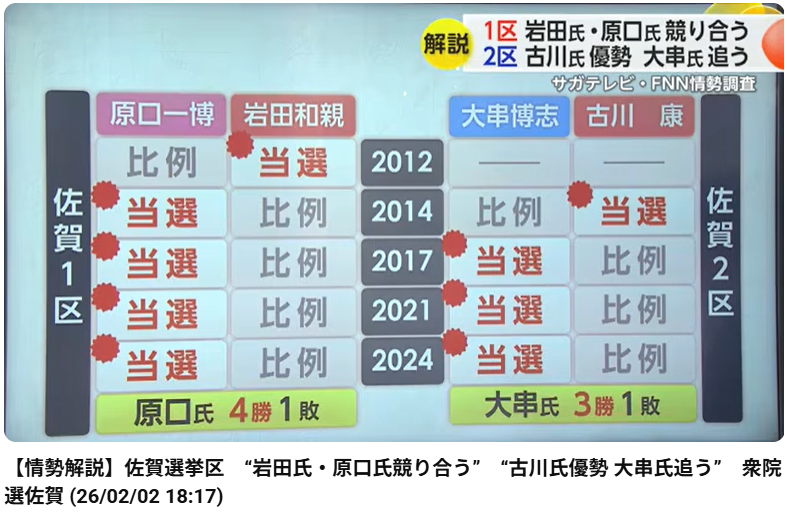 【情勢解説】佐賀選挙区 “岩田氏・原口氏競り合う” “古川氏優勢 大串氏追う” 衆院選佐賀 (26/02/02 18:17)
