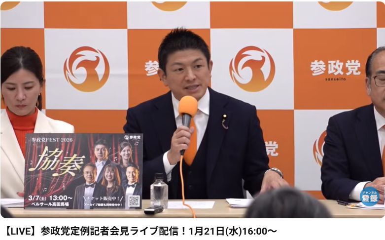 この動画は2026年1月21日に配信された「参政党定例記者会見」のライブ映像です。