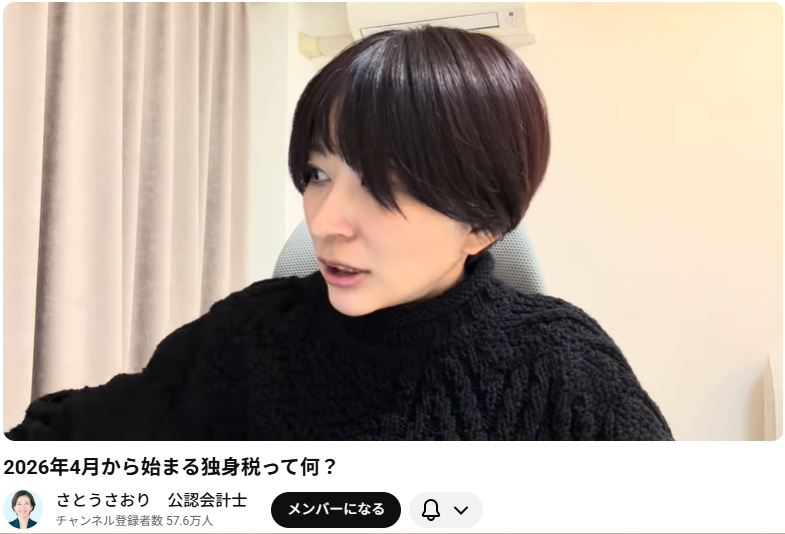 この動画は、公認会計士のさとうさおり氏が、2026年4月から導入される「独身税」と揶揄される制度の実態について解説しているものです。