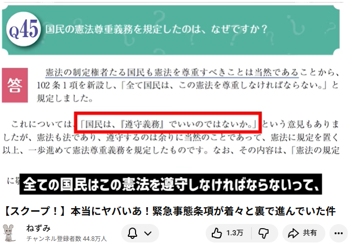 - 動画では、憲法は本来、国家権力を縛り、国民・市民を国家から守るためのものである(立憲主義)という基本原則を、この規定が無視していると強く批判しています [12:40], [13:28]。