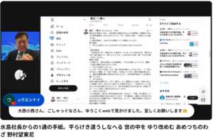 原口氏はスペースに入るなり、松田氏(ドラ氏)に対して「勝手なこと言っちゃだめだよ」「またドラの悪いところが出てる」と厳しく釘を刺しています。