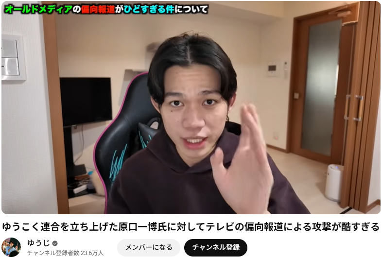 この動画は、YouTuberのゆうじ氏による、テレビなどの「オールドメディア」による報道の偏り(偏向報道)と、新党「ゆうこく連合」を立ち上げた原口一博氏に対する攻撃的な報道について私見を述べたものです。