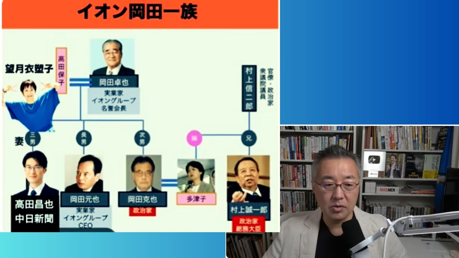 - 質問の目的への疑義: 岡田氏の質問は、中国を利すること、および中国で事業を展開する兄(イオン・グループの経営責任者)の事業のためのものであったと強く主張しています [03:43]。