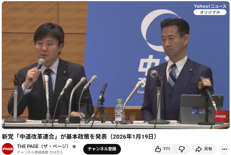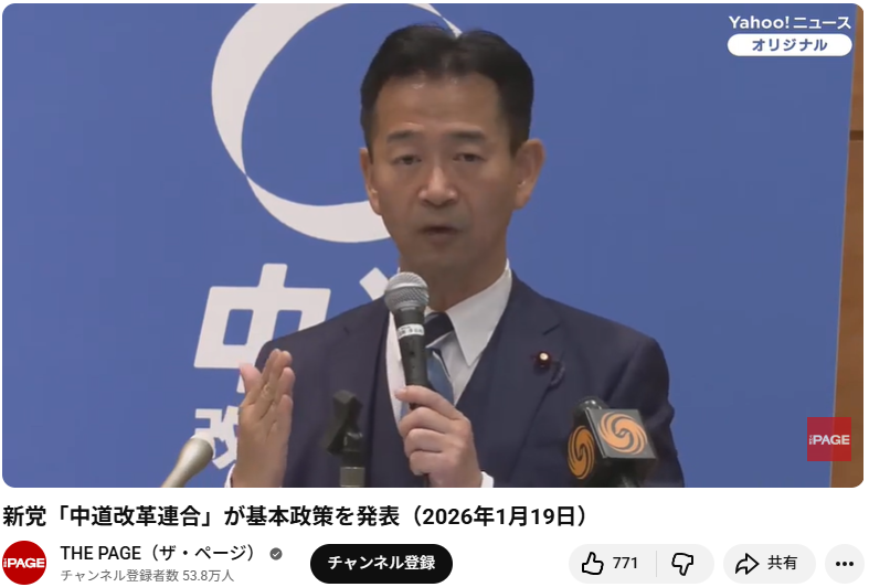 この動画は、2026年1月19日に行われた新党「中道改革連合」の基本政策発表記者会見の様子を収めたものです。