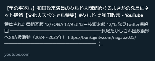 ※和田政宗氏のクルド人問題に関する文化人放送局の批判動画は現在再生できない状態。