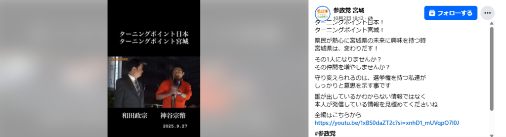 今回の知事選では、参政党 が和田氏を「応援」する意思を明確にしており、そのキャッチコピーが「#ターニングポイント宮城」である。 (Facebook)