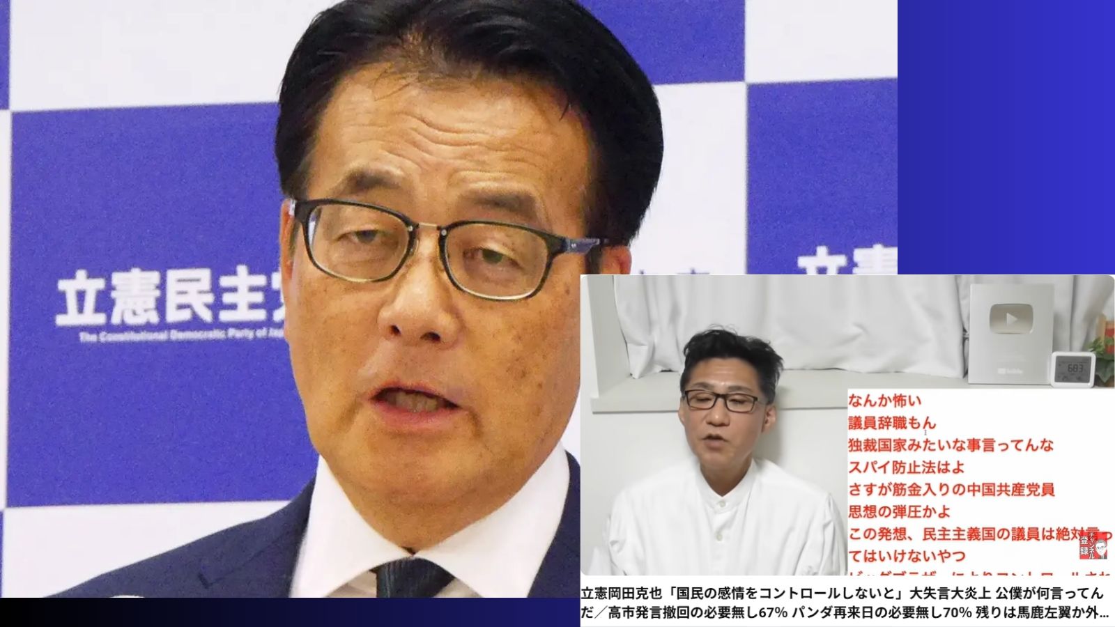 立憲岡田克也「国民の感情をコントロールしないと」大失言大炎上 公僕が何言ってんだ/高市発言撤回の必要無し67% パンダ再来日の必要無し70% 残りは馬鹿左翼か外国人 251222