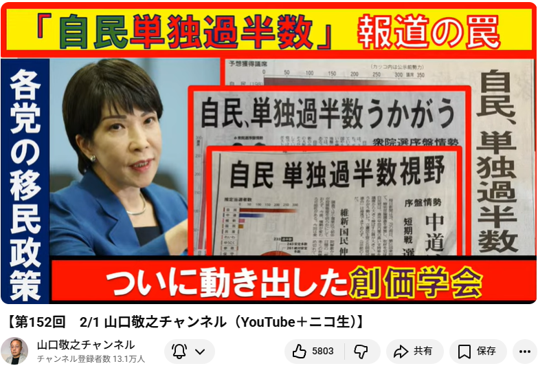 ジャーナリストの山口敬之氏が、2026年2月1日に配信したこの動画では、主に衆議院選挙の情勢分析と、大手メディアの報道の信憑性について語られています。