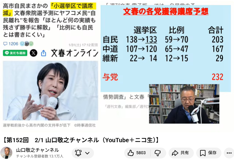 - 文春の予測: 一方で週刊文春は、自民と維新を合わせても過半数に届かず、高市首相が退陣に追い込まれる可能性(与党で232議席程度)を指摘しており、山口氏はこちらの可能性も十分にあると分析しています [05:14]。
