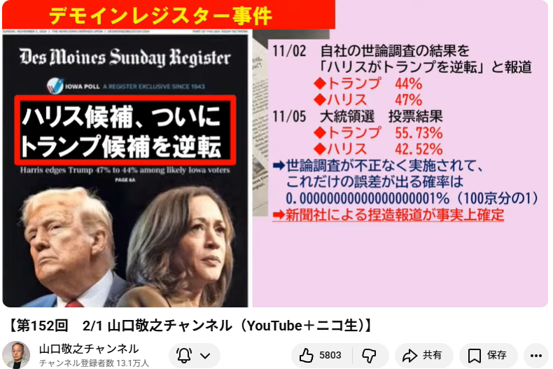 - 中国の影響: 山口氏は、アメリカの事例(デモイン・レジスター紙の世論調査捏造疑惑)を引き合いに出し、中国から資金提供を受けているメディアが、特定の勢力(中道など)を有利にするために世論調査を操作している可能性を強く疑っています [50:51]。