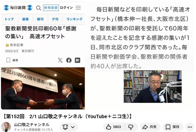- 毎日新聞の事例: 毎日新聞のグループ会社が「聖教新聞」の印刷を長年受託しており、経営的に創価学会に依存している背景を説明 [41:03]。