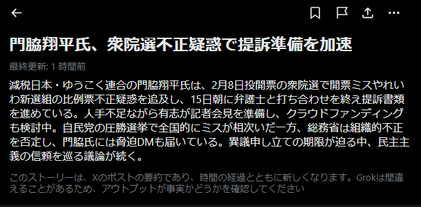 • ハッシュタグキャンペーン: X(旧Twitter)で「#選挙が盗まれた」や「#門脇翔平」を付けて、各地の異常な事例や証拠写真を共有してほしいと依頼しています [08:51]。