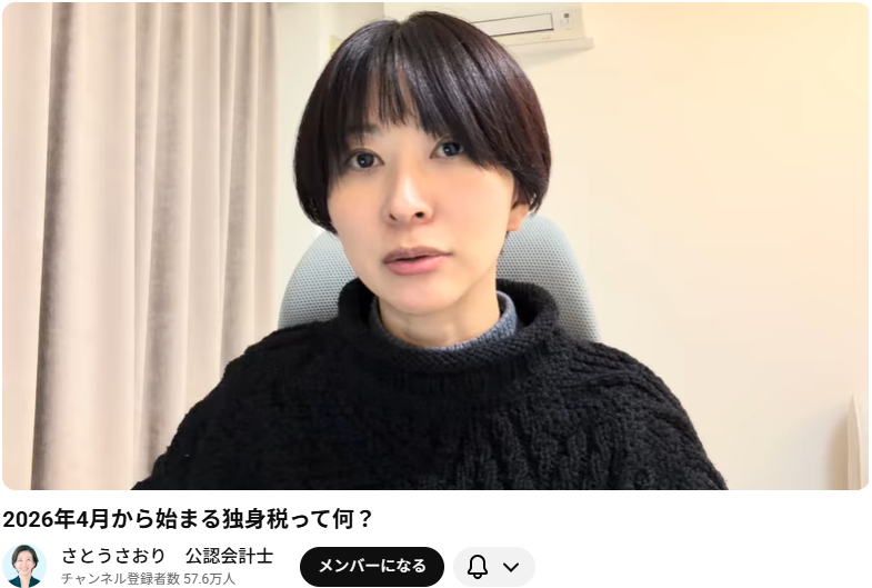 2026年4月から始まる独身税って何? この動画は、公認会計士のさとうさおり氏が、2026年4月から導入される「独身税」と揶揄される制度の実態について解説しているものです。 動画の主な内容 1. 「独身税」の正体 実際には「独身税」という名前の税金が新設... -