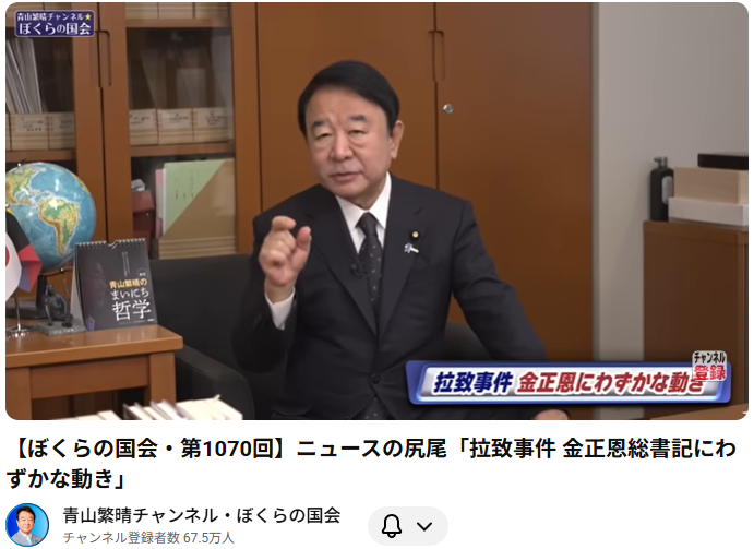 拉致事件 金正恩総書記にわずかな動き この動画は、青山繁晴氏による「青山繁晴チャンネル・ぼくらの国会」の第1070回放送です。 青山氏は、長年安全保障に関わってきた専門家としての視点から、北朝鮮による日本人拉致問題の解決に向けたわずかながらも動... -