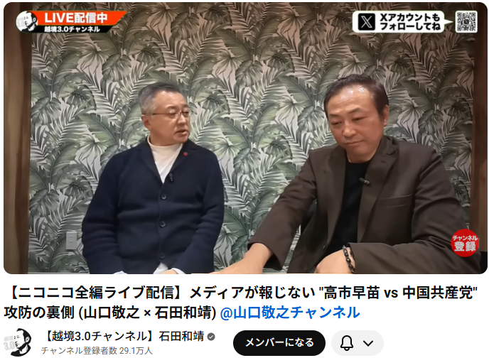 【ニコニコ全編ライブ配信】メディアが報じない "高市早苗 vs 中国共産党" 攻防の裏側 (山口敬之 × 石田和靖) この動画は、ジャーナリストの山口敬之氏をゲストに迎え、石田和靖氏の「【越境3.0チャンネル】石田和靖」チャンネルで配信されたライブ番組の... -