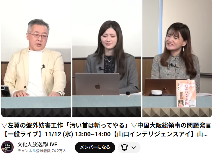 ▽左翼の盤外妨害工作「汚い首は斬ってやる」▽中国大阪総領事の問題発言【一般ライブ】11/12 (水) 13:00~14:00【山口インテリジェンスアイ】山口 敬之×佐波優子×Sarina この動画は、文化人放送局LIVEチャンネルのライブ配信のアーカイブです。 動画では、主... -