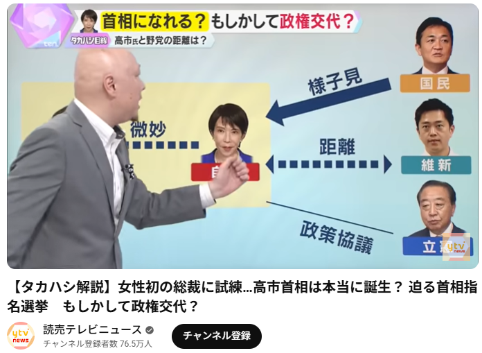 【タカハシ解説】女性初の総裁に試練…高市首相は本当に誕生? 迫る首相指名選挙 もしかして政権交代? YouTubeチャンネル・読売テレビニュースで公開されたこの動画は、高市早苗氏の自民党総裁就任後の政治情勢、特に迫る首相指名選挙での政権交代の可能... -