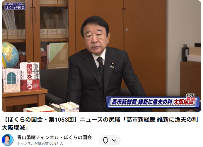 【ぼくらの国会・第1053回】ニュースの尻尾「高市新総裁 維新に漁夫の利 大阪壊滅」 この動画は、青山繁晴氏が、自民党新総裁選出後の政治状況、特に高市新総裁と日本維新の会(維新)の関係、そしてその結果が大阪にもたらす影響について解説したものです... -