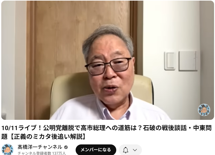 10/11ライブ!公明党離脱で高市総理への道筋は?石破の戦後談話・中東問題【正義のミカタ後追い解説】 このYouTube動画は、髙橋洋一氏が政治情勢について解説するライブ配信です。 動画の概要 動画内容の要点 高市氏の総理就任や政治日程、公明党の連立離... -